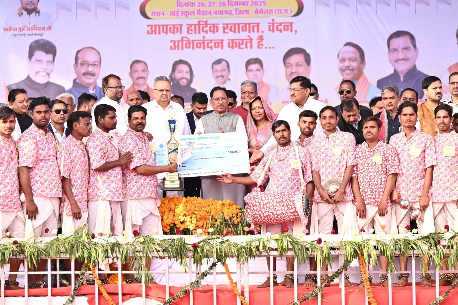 (संवाद एक्सप्रेस)बेमेतरा,अठाईस दिसम्बर दो हजार पच्चीस प्रदेश के यशस्वी मुख्यमंत्री विष्णुदेव साय ने आज जिला बेमेतरा के नवागढ़ में आयोजित तीन दिवसीय गुरु घासीदास लोक कला महोत्सव एवं राज्य स्तरीय ओपन पंथी नृत्य महोत्सव के भव्य समापन समारोह में सहभागिता की इस पावन अवसर पर मुख्यमंत्री साय ने नवागढ़ स्थित जोड़ा जैतखाम में विधिवत श्वेत ध्वज चढ़ाकर संत शिरोमणि बाबा गुरु घासीदास जी के प्रति अपनी गहरी श्रद्धा और आस्था व्यक्त की मुख्यमंत्री ने संत बाबा गुरु घासीदास जी के श्रीचरणों में नारियल एवं श्रीफल अर्पित कर प्रदेश के सुखद, समृद्ध एवं विकसित भविष्य की मंगल कामना की उन्होंने सतनाम समाज के स्वजनों को संबोधित करते हुए कहा कि बाबा गुरु घासीदास जी का जीवन सत्य,अहिंसा,समानता और मानवता का महान संदेश देता है, जो आज भी समाज को सही दिशा दिखाने का कार्य कर रहा है।
