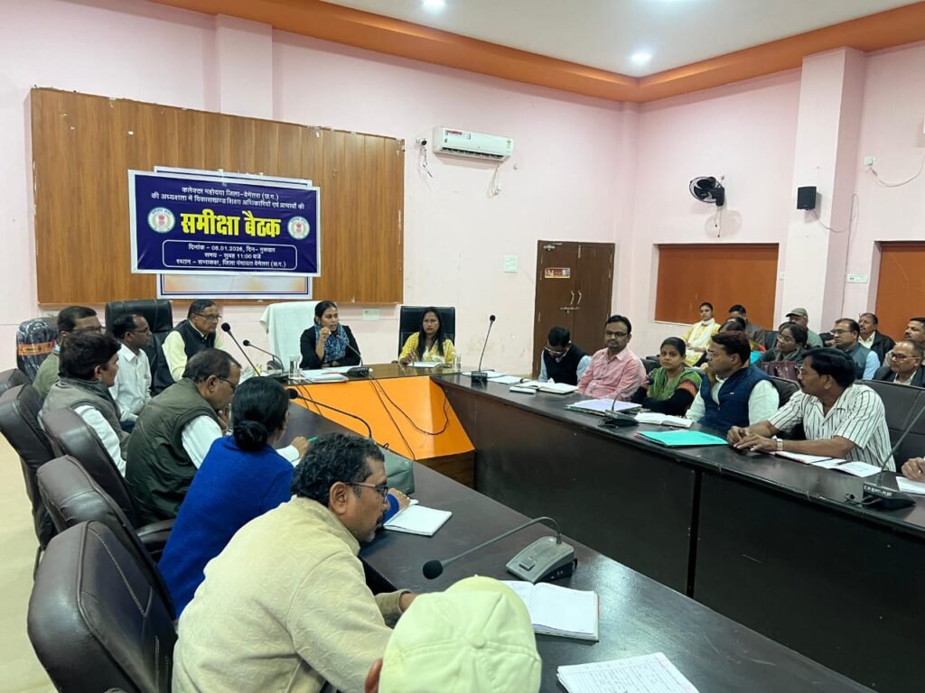 बेमेतरा, कलेक्टर सुश्री प्रतिष्ठा ममगाईं की अध्यक्षता में आज जिला कार्यालय के सभाकक्ष में विकासखंड शिक्षा अधिकारियों एवं शासकीय हाईस्कूल हायर सेकेंडरी स्कूलों के प्राचार्यों की महत्वपूर्ण समीक्षा बैठक आयोजित की गई बैठक में जिले की शैक्षणिक स्थिति परीक्षा परिणाम शिक्षकों की उपस्थिति विद्यार्थियों की नियमितता एवं आगामी परीक्षाओं की तैयारियों की विस्तार से समीक्षा की गई।