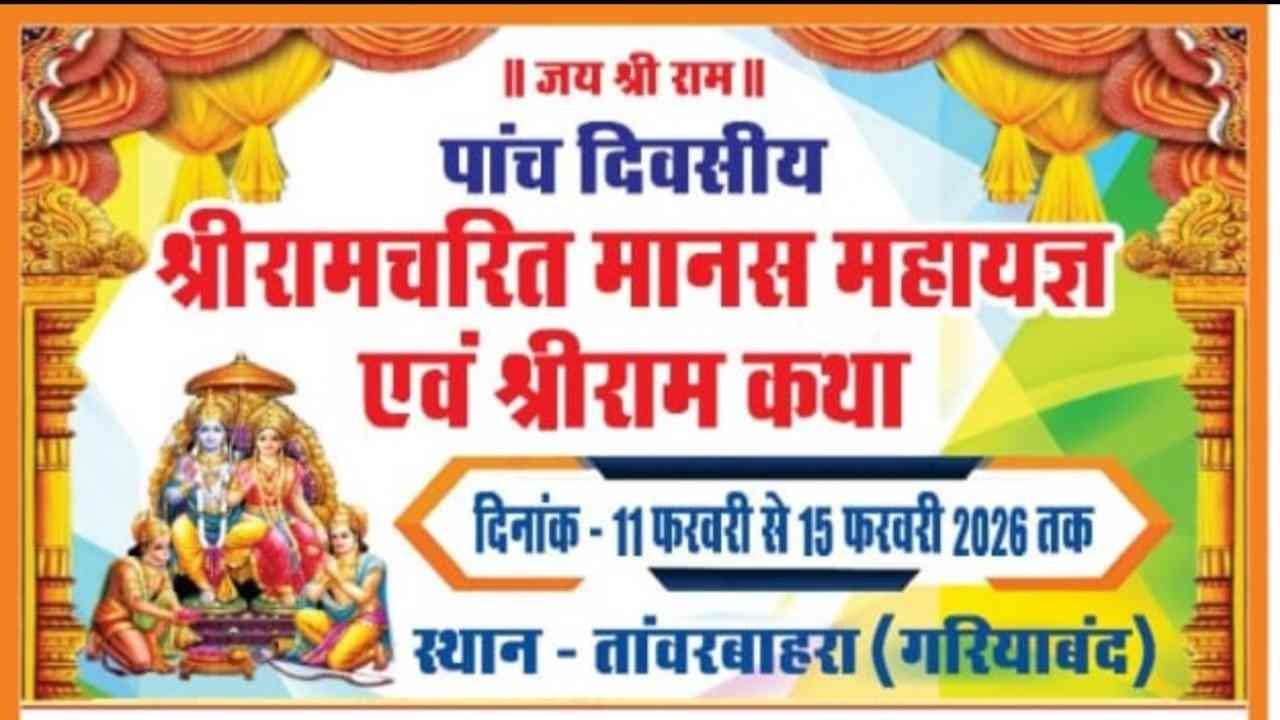 (संवाद एक्सप्रेस)गरियाबंद। जिला मुख्यालय से लगे ग्राम ताँवरबाहरा में धर्म, आस्था और भक्ति का अद्भुत संगम देखने को मिलेगा। ग्रामवासियों के संयुक्त तत्वावधान में पांच दिवसीय श्रीरामचरित मानस महायज्ञ एवं श्रीराम कथा का भव्य आयोजन दिनांक 11 फरवरी से 15 फरवरी तक किया जा रहा है। इस धार्मिक आयोजन को लेकर पूरे गांव में उत्साह और श्रद्धा का वातावरण व्याप्त है।