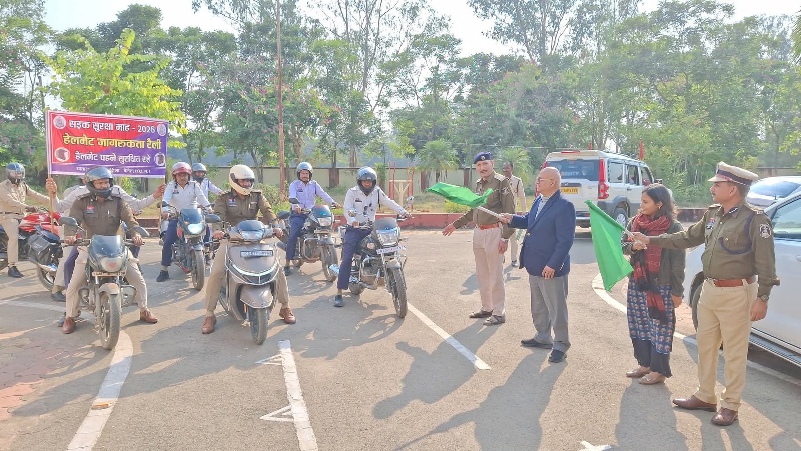 माननीय न्यायमूर्ति अभय मनोहर सप्रे, कलेक्टर सुश्री प्रतिष्ठा ममगाईं एवं वरिष्ठ पुलिस अधीक्षक रामकृष्ण साहू द्वारा बाइक हेलमेट रैली को हरी झंडी दिखाकर रवाना किया गया यह रैली रक्षित निरीक्षक प्रवीण खलखो एवं थाना प्रभारी सिटी कोतवाली निरीक्षक मयंक मिश्रा के नेतृत्व में सर्किट हाउस से प्रारंभ होकर कोबिया चौक सिग्नल चौक गस्ती चौक गौरवपथ रोड कर्मा माता चौक भारत माता चौक बस स्टैण्ड चौपाटी जय स्तंभ चौक रेस्ट हाउस चौक होते हुए यातायात कार्यालय थाना सिटी कोतवाली परिसर तक पहुँची रैली के माध्यम से दुपहिया वाहन चालकों को हेलमेट पहनने सुरक्षित एवं संयमित गति से वाहन चलाने का संदेश दिया गया।