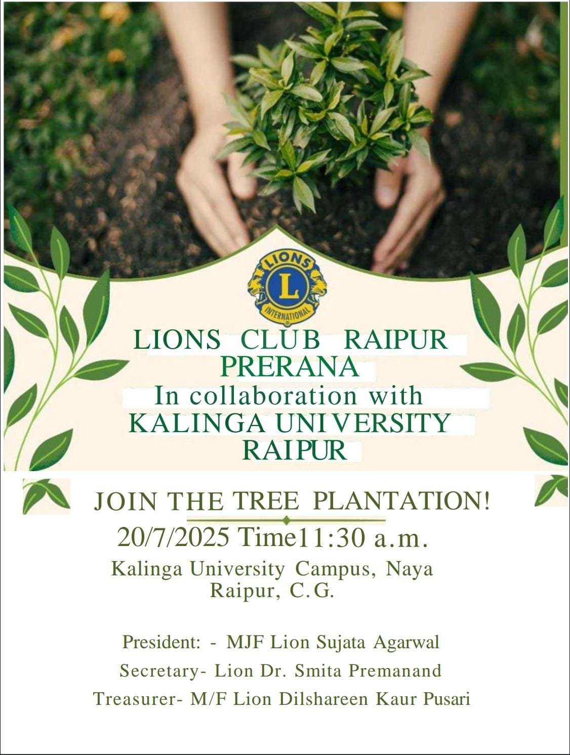 22 जुलाई 2025 को कलिंगा विश्वविद्यालय एवं लायंस क्लब रायपुर प्रेरणा के संयुक्त तत्वावधान में विश्वविद्यालय परिसर में एक प्रेरणादायक वृक्षारोपण अभियान (Tree Plantation Drive) का आयोजन किया गया। इस कार्यक्रम का उद्देश्य पर्यावरण संरक्षण, हरित आवरण को बढ़ावा देना तथा विद्यार्थियों एवं कर्मचारियों में पर्यावरणीय चेतना का प्रसार करना था।