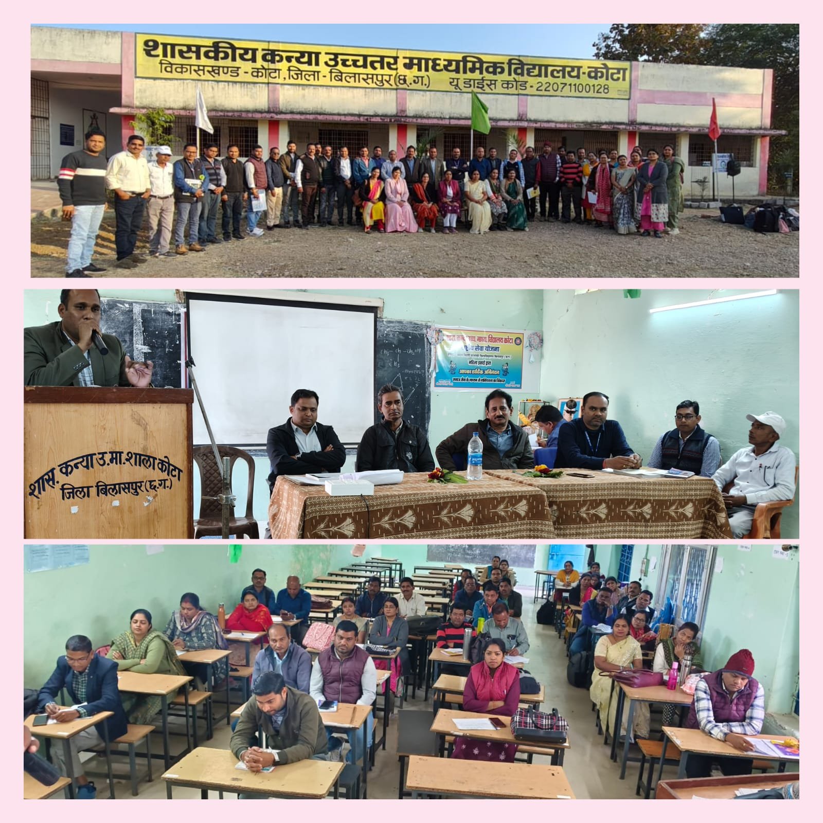 बिलासपुर कोटा,,विकासखंड के हाई एवं हायर सेकंडरी विद्यालय की व्याख्याताओं का ब्लूप्रिंट प्रश्न पत्र निर्माण एवं शिक्षण शास्त्र पर प्रशिक्षण का सफल आयोजन हुआ जिसमें दो चरणों में विकासखंड कोटा के समस्त विज्ञान गणित समूह के व्याख्याताओं ने पांच-पांच दिवस का चरणवार प्रशिक्षण प्राप्त किया इस दो चरणों में आयोजित प्रशिक्षण को बी आर जी मनोज श्रीवास कन्या उच्चतर माध्यमिक विद्यालय कोटा,अमित साहू हायर सेकेंडरी गोबरीपाट,वीरेंद्र जोशी हायर सेकेंडरी टेंगनमाड़ा,सुशील पटेल हायर सेकेंडरी मिट्ठू नवागांव, हरप्रसाद कौशिक हायर सेकेंडरी शीश के द्वारा प्रशिक्षण दिया गया प्रशिक्षण के प्रारंभ दिवस में मुख्य अतिथि के रूप में विकासखंड शिक्षा अधिकारी कोटा व प्रशिक्षण स्थल शासकीय कन्या उच्चतर माध्यमिक विद्यालय कोटा की प्राचार्य श्रीमती आशा दत्ता के गरिमामयी उपस्थिति में प्रशिक्षण का शुभारंभ किया गया,प्रशिक्षण का सफल आयोजन पश्चात समापन कार्यक्रम में मुख्य वक्ता के रूप में विकासखंड शिक्षा अधिकारी श्री नरेंद्र मिश्रा सहायक विकासखंड शिक्षा अधिकारी श्री नवनीत तंबोली तेंदुआ प्राचार्य श्री गोपाल सिंह ध्रुव प्रमुख रूप से उपस्थित रहे।